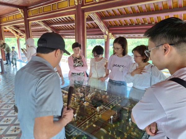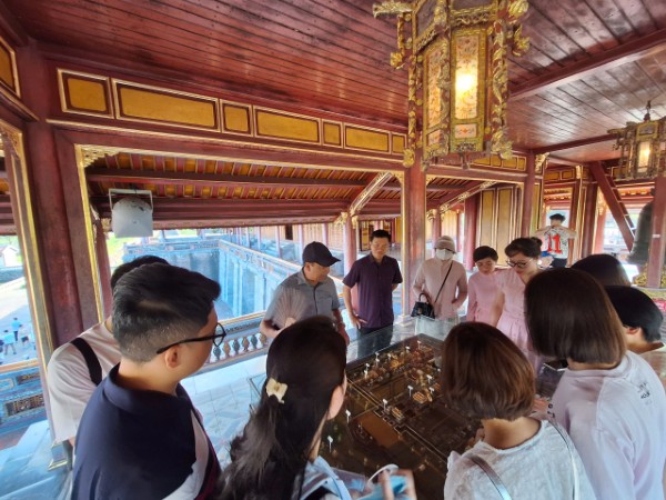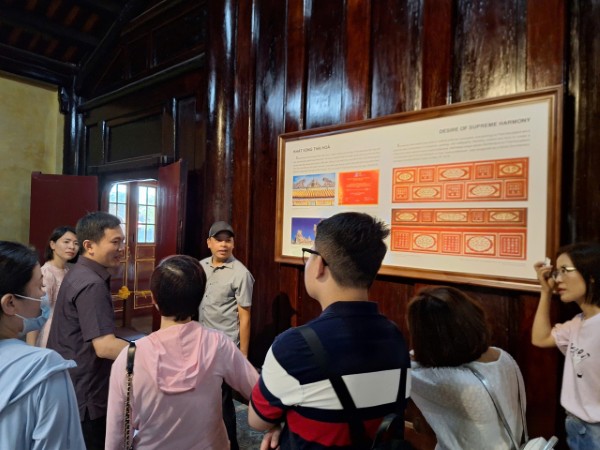 Đoàn nghe thuyết trình về ý nghĩa “Khát vọng Thái Hòa” trên hoa văn, kiến trúc của Điện Thái Hòa (vừa được hoàn tất trùng tu năm 2024).