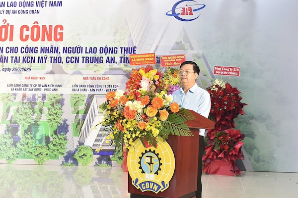 Phó Thủ tướng nhấn mạnh công trình nhà ở xã hội công đoàn thuộc Dự án xây dựng thiết chế của công đoàn tại khu công nghiệp Mỹ Tho, cụm công nghiệp Trung An, tỉnh Đồng Tháp được khởi công xây dựng càng có ý nghĩa quan trọng. Đó vừa là sự cụ thể hóa Đề án “Đầu tư xây dựng ít nhất 1 triệu căn hộ nhà ở xã hội cho đối tượng thu nhập thấp, công nhân khu công nghiệp giai đoạn 2021-2030” đã được Thủ tướng Chính phủ phê duyệt; vừa là dự án đầu tiên do Tổng Liên đoàn Lao động Việt Nam đầu tư bằng nguồn tài chính công đoàn được triển khai thực hiện theo Luật Nhà ở năm 2023.