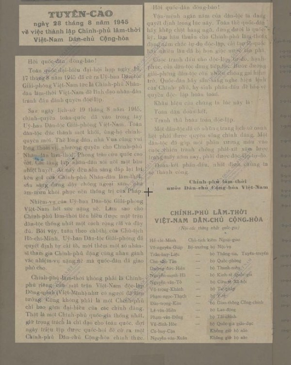 Tuyên cáo ngày 28/8/1945 đã trở thành dấu mốc quan trọng, đặt nền móng, đánh dấu sự ra đời của một Chính phủ nước Việt Nam mới.