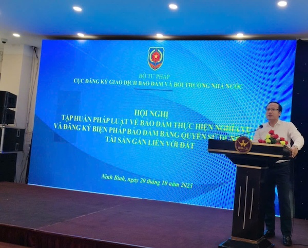 Thực hiện Kế hoạch công tác năm 2025 (ban hành kèm theo Quyết định số 1292/QĐ-BTP ngày 18/4/2025 của Bộ trưởng Bộ Tư pháp), ngày 20/10/2025, Cục Đăng ký giao dịch bảo đảm và Bồi thường nhà nước phối hợp với Sở Tư pháp tỉnh Ninh Bình tổ chức Hội nghị tập huấn pháp luật về bảo đảm thực hiện nghĩa vụ và đăng ký biện pháp bảo đảm bằng quyền sử dụng đất, tài sản gắn liền với đất.